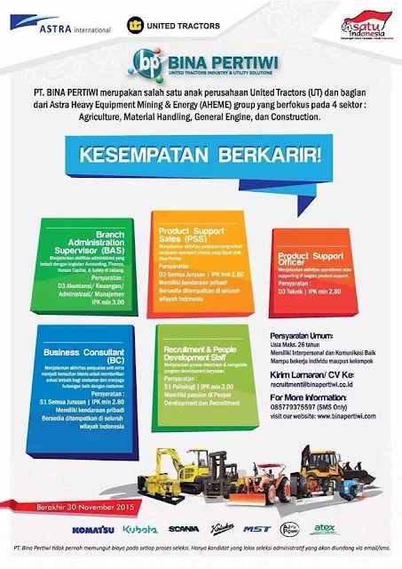 1. Male, max 25 years old2. Diploma degree from Mechanical / Otomotive / Heavy Equipment /Electro and ElectronicaEngineering (GPA: 2,75 ~ up)3. Physically and mentally fit4. Never been enlisted as a candidate for PT SIS in between 2013 - 2014Please send your application letter together with full resume copy of diplomas andrecent photograph not later than June 13th, 2015 to VDC SV UGM.Bagi kamu Mahasiswa Elins SV UGM juga dipersilahkan mendaftar!!!!berlaku 13-06-2015